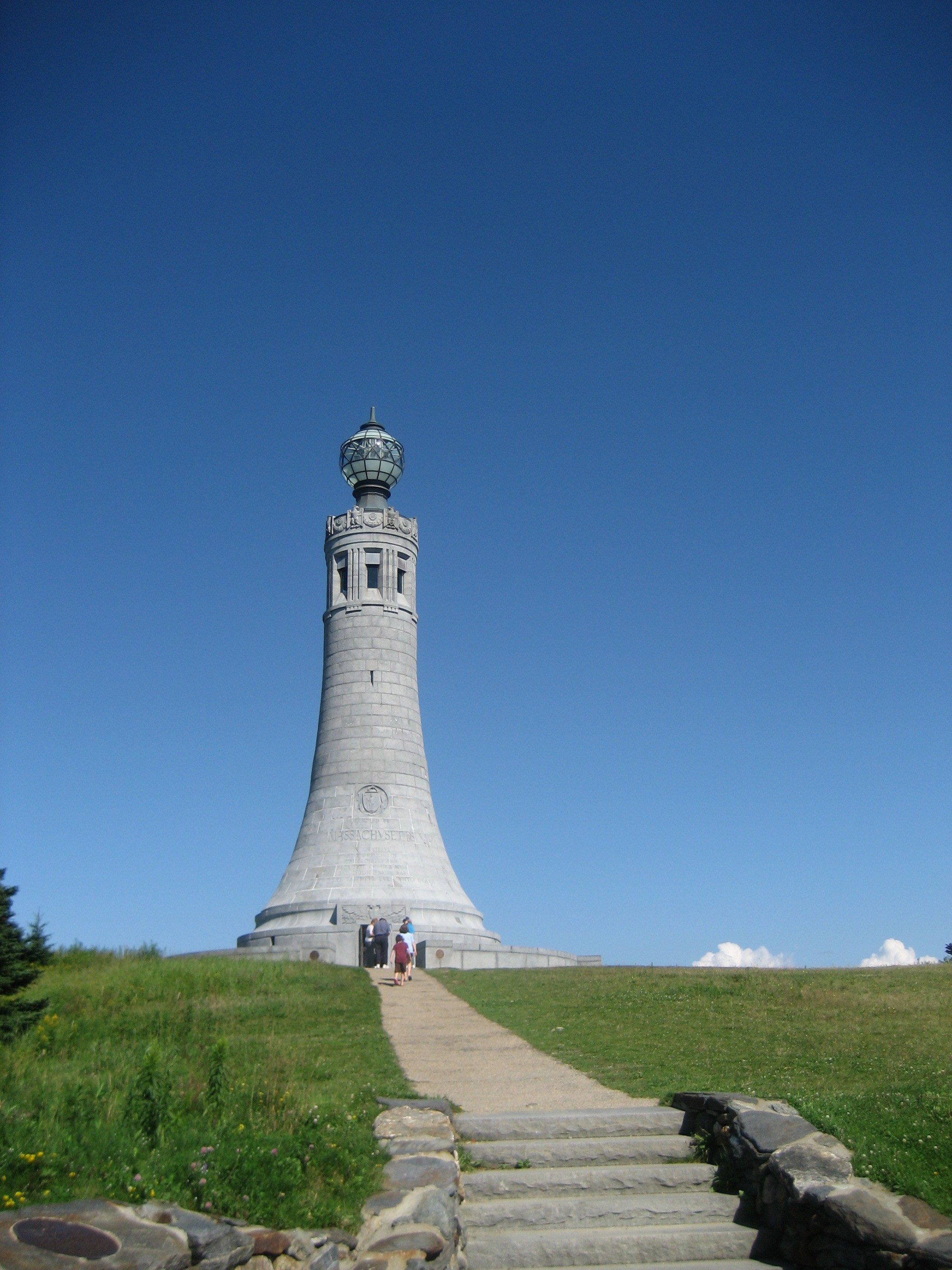 A 93-foot-tall lighthouse-like structure atop Mount Greylock, the highest summit (3,505 feet) in Massachusetts. Eight narrow windows at the top of the shaft give views to the surrounding landscape from within an observatory that is reached by iron spiral staircases.  A semi-transparent glass globe sits atop a stem that emerges from the crown of the shaft. The crown is decorated with art deco eagles. The globe is lit at night, becoming a beacon.